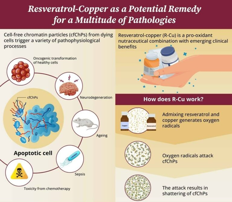 The chromatin is a mixture of proteins and DNA that forms the structure of the chromosomes within the nucleus of the cell. Cells that die release “cfChPs”, or cell-free particles of chromatin, into the bloodstream. Recent evidence suggests that cfChPs can have toxic effects on healthy cells by damaging their DNA and activating proinflammatory processes. Researchers at the Tata Memorial Centre in India’s Advanced Centre for Treatment, Research & Education in Cancer, ACTREC, recently demonstrated that a prooxidant mixture containing resveratrol, copper, and R-Cu, was beneficial to patients undergoing chemotherapy for advanced stomach cancer. Combining R and Cu (RCu) can lead to the production of free oxygen radicals that can inactivate cfChPs.